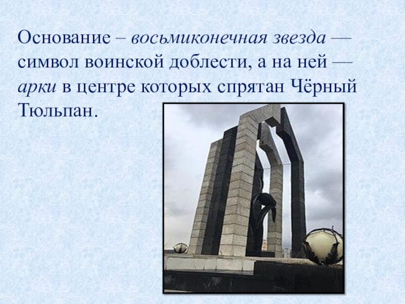 Слайд 16Основание – восьмиконечная звезда — символ воинской доблести, а на ней — арки