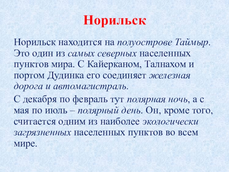 С декабря по февраль тут полярная ночь, а с мая по июль – полярный день. Он, кроме того, считается одним из наиболее экологически загрязненных населенных пунктов во всем мире.