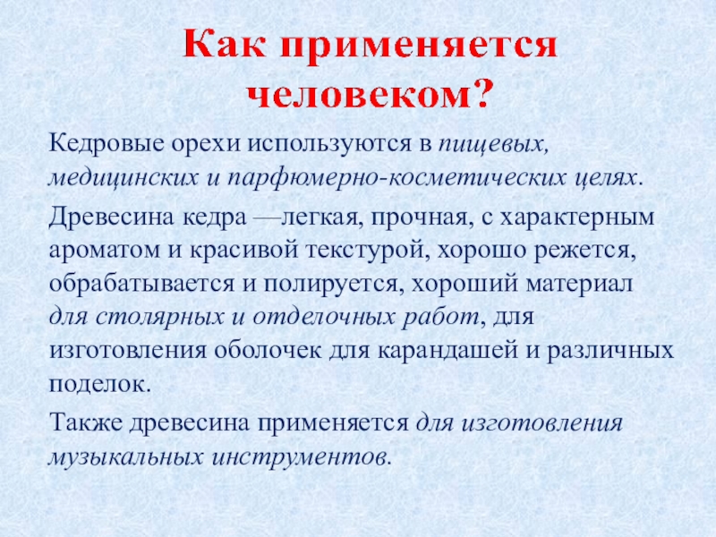 Слайд 11Кедровые орехи используются в пищевых, медицинских и парфюмерно-косметических целях.