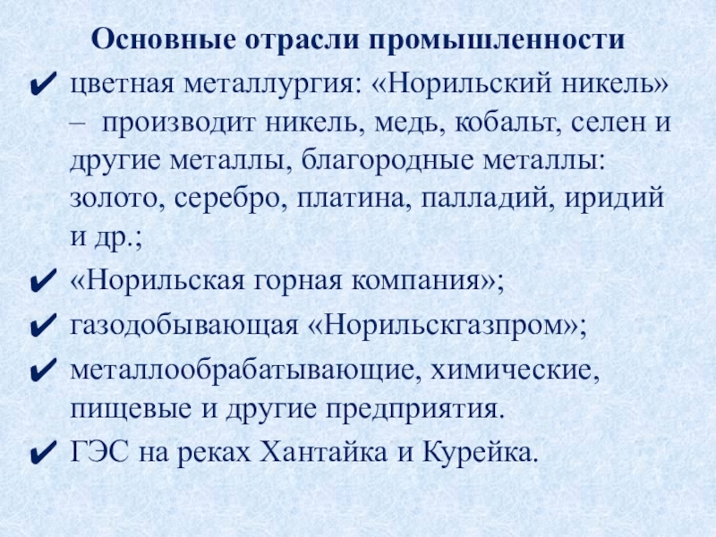 цветная металлургия: «Норильский никель» – производит никель, медь, кобальт,