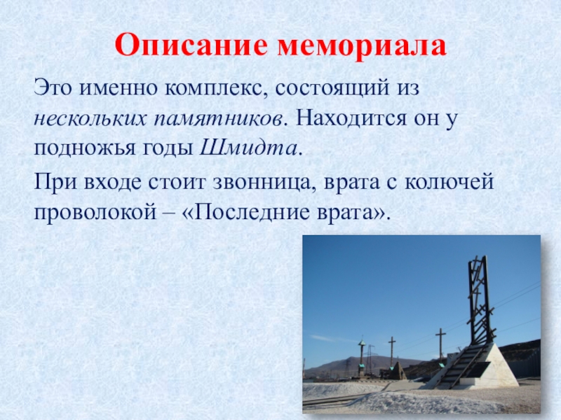 При входе стоит звонница, врата с колючей проволокой – «Последние врата».