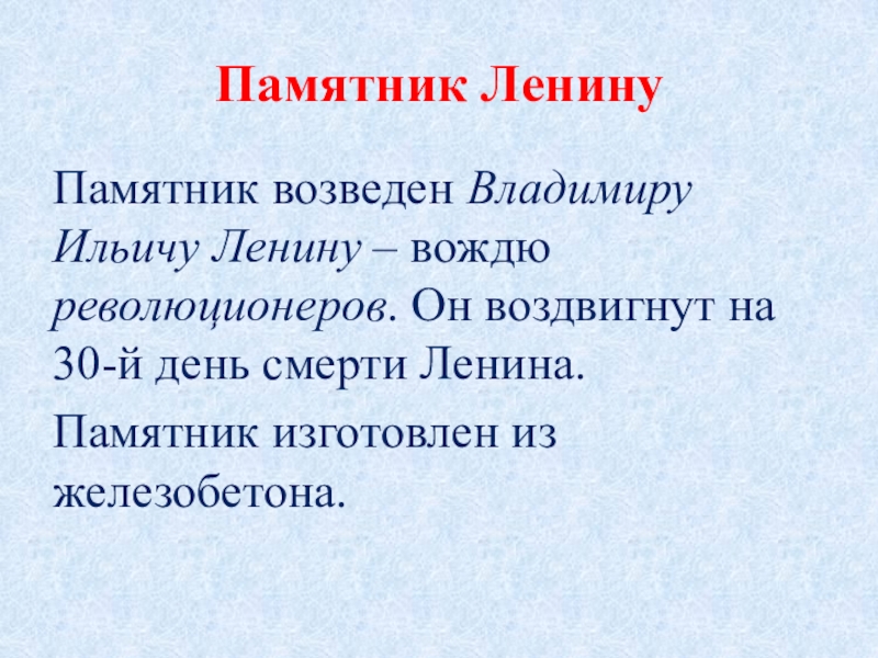 Памятник возведен Владимиру Ильичу Ленину – вождю революционеров. Он воздвигнут