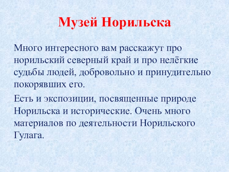 Есть и экспозиции, посвященные природе Норильска и исторические. Очень много материалов по деятельности Норильского Гулага.