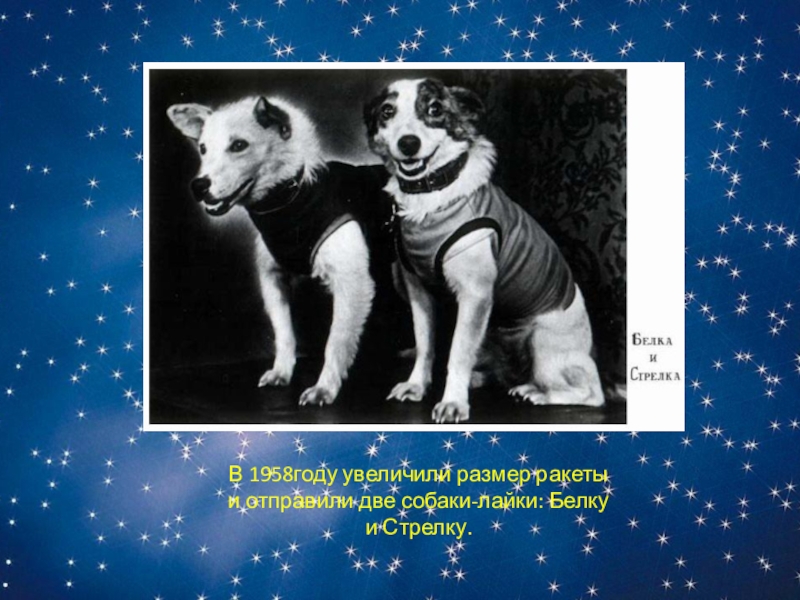 Слайд 8В 1958году увеличили размер ракеты и отправили две собаки-лайки: Белку и
