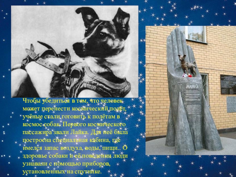 стали готовить к полётам в космос собак. Первого космического пассажира звали Лайка. Для неё была построена специальная кабина, где имелся запас воздуха, воды, пищи.. О здоровье собаки и её поведении люди узнавали с помощью приборов, установленных на спутнике.