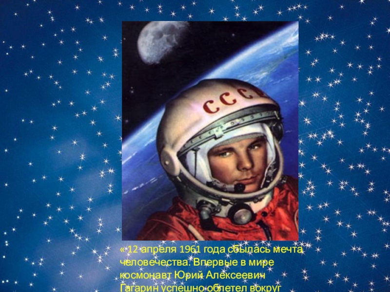 « 12 апреля 1961 года сбылась мечта человечества. Впервые в мире космонавт Юрий Алексеевич Гагарин успешно облетел