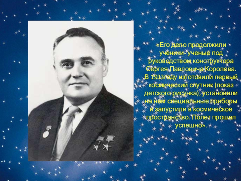 «Его дело продолжили ученики- ученые под руководством конструктора Сергея Павловича Королева. В 1933году изготовили первый космический спутник