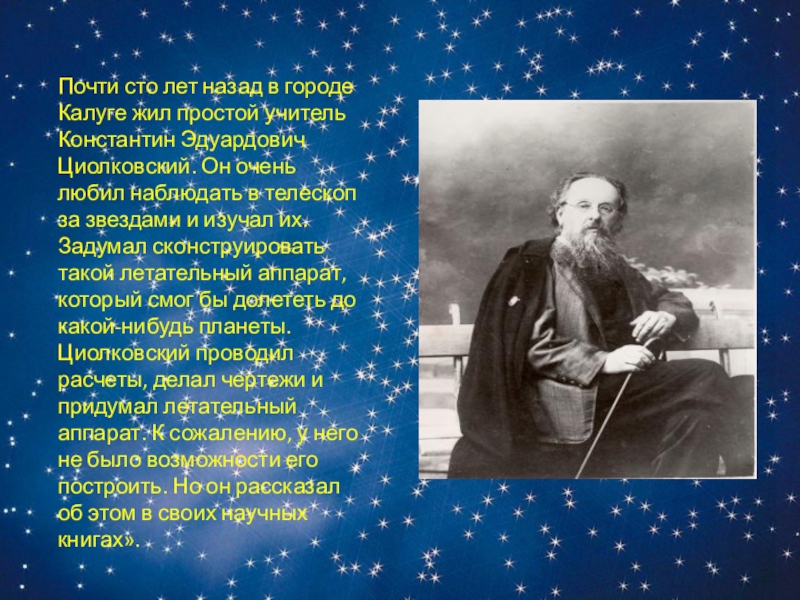 Почти сто лет назад в городе Калуге жил простой учитель Константин Эдуардович Циолковский. Он очень любил наблюдать