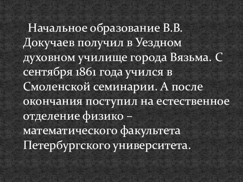 Начальное образование В.В.Докучаев получил в Уездном духовном училище города Вязьма. С сентября 1861 года учился