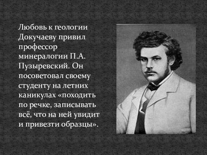 Любовь к геологии Докучаеву привил профессор минералогии П.А.Пузыревский. Он посоветовал своему студенту на летних каникулах