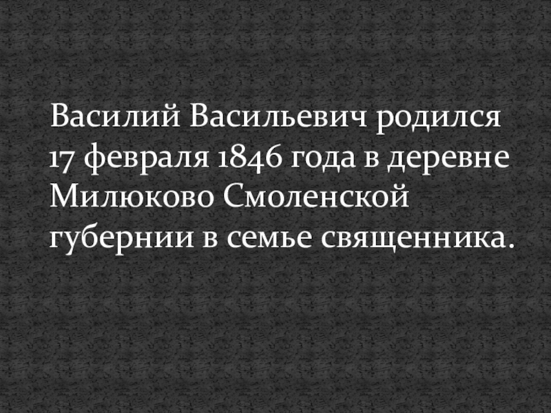 Василий Васильевич родился 17 февраля 1846 года в деревне Милюково Смоленской губернии в семье священника.