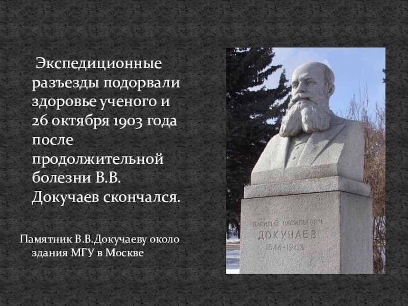 Экспедиционные разъезды подорвали здоровье ученого и 26 октября 1903 года после продолжительной болезни В.В.Докучаев скончался.Памятник