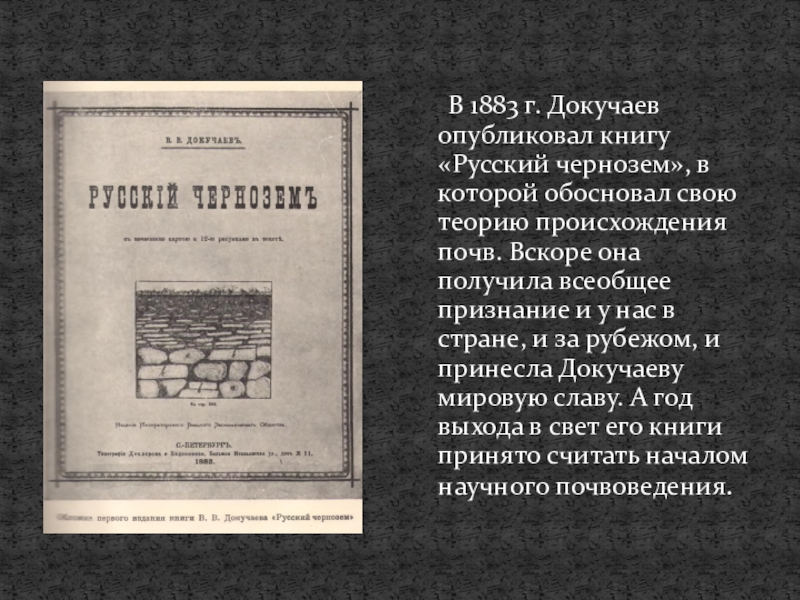 В 1883 г. Докучаев опубликовал книгу «Русский чернозем», в которой обосновал свою теорию происхождения