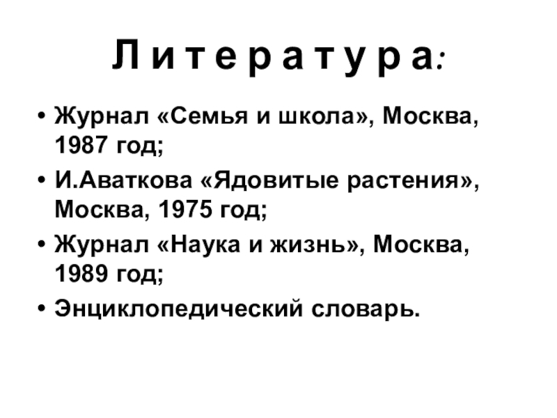 И.Аваткова «Ядовитые растения», Москва, 1975 год;