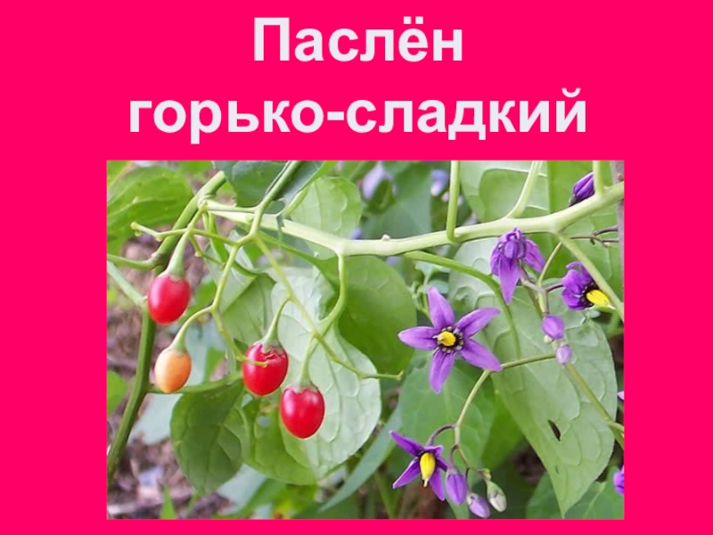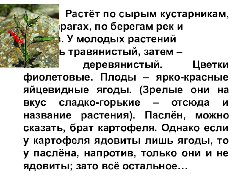 сырым кустарникам, в оврагах, по берегам рек и прудов. У молодых растений стебель травянистый, затем – почти деревянистый. Цветки фиолетовые. Плоды – ярко-красные яйцевидные ягоды. (Зрелые они на вкус сладко-горькие – отсюда и название растения). Паслён, можно сказать, брат картофеля. Однако если у картофеля ядовиты лишь ягоды, то у паслёна, напротив, только они и не ядовиты; зато всё остальное…