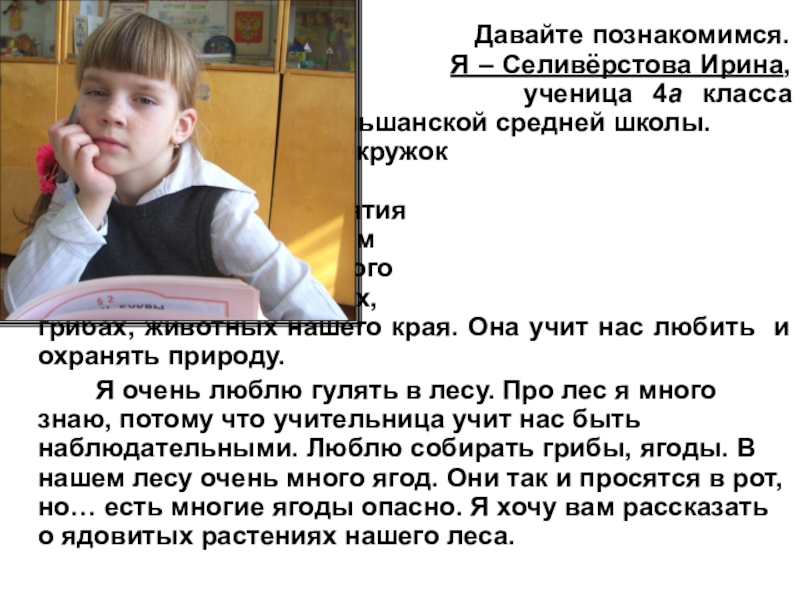 Давайте познакомимся. Я – Селивёрстова Ирина, ученица 4а класса Ольшанской средней школы. В школе у нас работает кружок «Познай мир природы». Я люблю посещать занятия кружка. Учительница нам рассказывает очень много интересного о растениях, грибах, животных нашего края. Она учит нас любить и охранять природу.