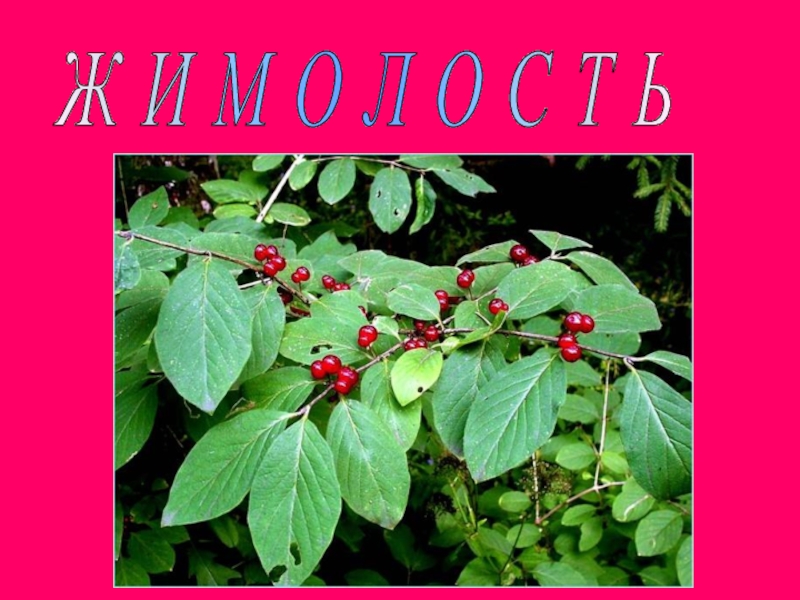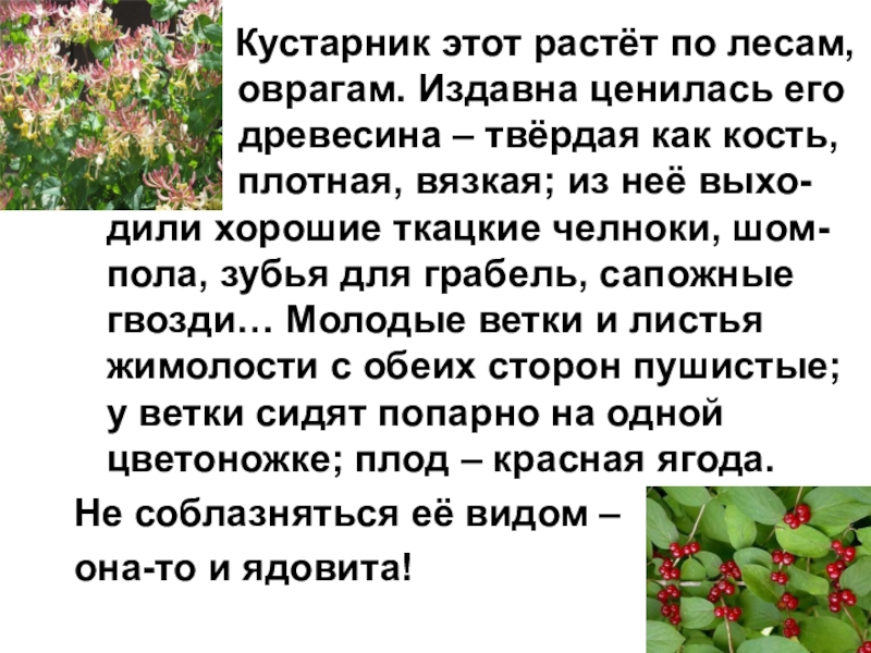 по лесам, о оврагам. Издавна ценилась его д древесина – твёрдая как кость, п плотная, вязкая; из неё выхо-дили хорошие ткацкие челноки, шом-пола, зубья для грабель, сапожные гвозди… Молодые ветки и листья жимолости с обеих сторон пушистые; у ветки сидят попарно на одной цветоножке; плод – красная ягода.