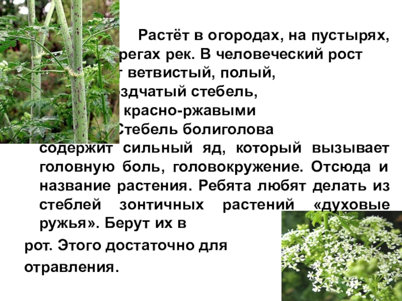 Растёт в огородах, на пустырях, берегах рек. В человеческий рост поднимает ветвистый, полый, тонкобороздчатый стебель, покрытый красно-ржавыми пятнами. Стебель болиголова содержит сильный яд, который вызывает головную боль, головокружение. Отсюда и название растения. Ребята любят делать из стеблей зонтичных растений «духовые ружья». Берут их в