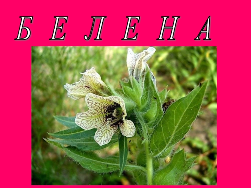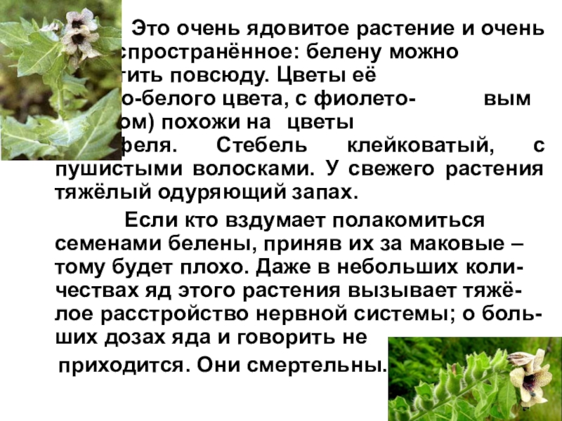 растение и очень распространённое: белену можно встретить повсюду. Цветы её (грязно-белого цвета, с фиолето- вым отливом) похожи на цветы картофеля. Стебель клейковатый, с пушистыми волосками. У свежего растения тяжёлый одуряющий запах.