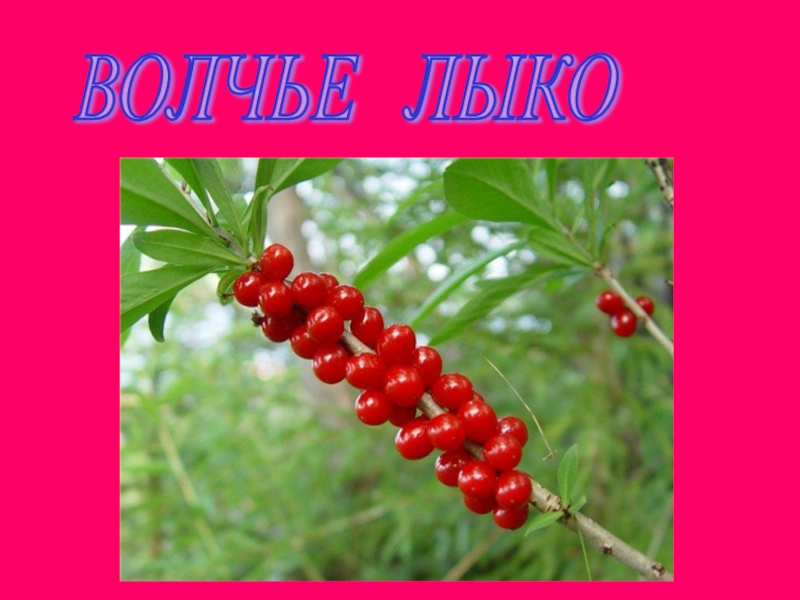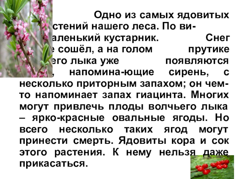 Одно из самых ядовитых растений нашего леса. По ви- ду – маленький кустарник. Снег ещё не сошёл, а на голом прутике волчьего лыка уже появляются цветы, напомина-ющие сирень, с несколько приторным запахом; он чем-то напоминает запах гиацинта. Многих могут привлечь плоды волчьего лыка – ярко-красные овальные ягоды. Но всего несколько таких ягод могут принести смерть. Ядовиты кора и сок этого растения. К нему нельзя даже прикасаться.