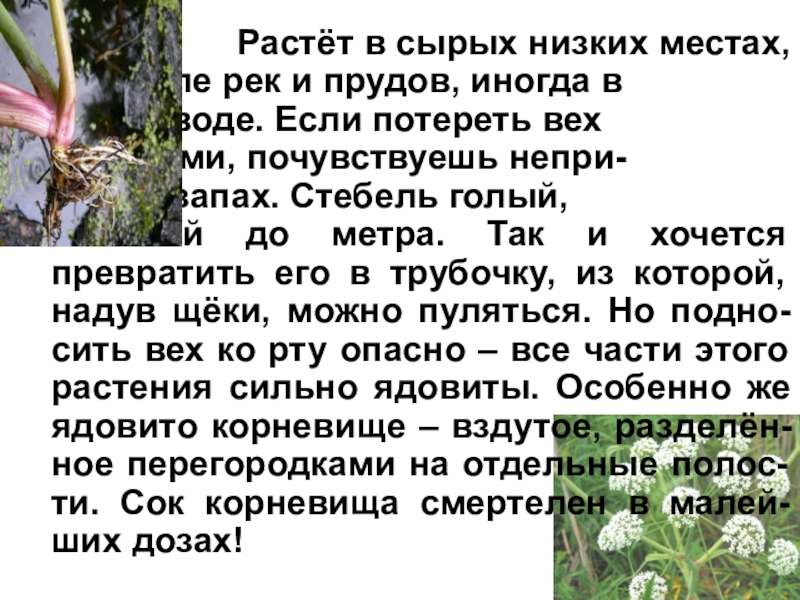 Растёт в сырых низких местах, возле рек и прудов, иногда в самой воде. Если потереть вех пальцами, почувствуешь непри- ятный запах. Стебель голый, высотой до метра. Так и хочется превратить его в трубочку, из которой, надув щёки, можно пуляться. Но подно-сить вех ко рту опасно – все части этого растения сильно ядовиты. Особенно же ядовито корневище – вздутое, разделён-ное перегородками на отдельные полос-ти. Сок корневища смертелен в малей-ших дозах!
