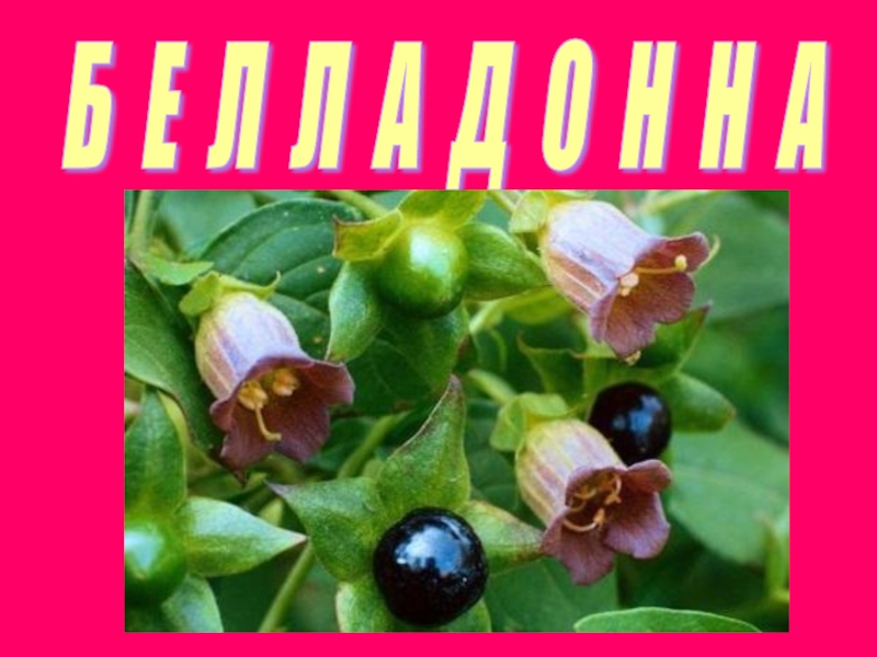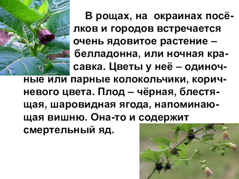 В рощах, на окраинах посё-сё лков и городов встречается чается очень ядовитое растение – растение белладонна, или ночная кра- а савка. Цветы у неё – одиноч-ные или парные колокольчики, корич-невого цвета. Плод – чёрная, блестя-щая, шаровидная ягода, напоминаю-щая вишню. Она-то и содержит смертельный яд.