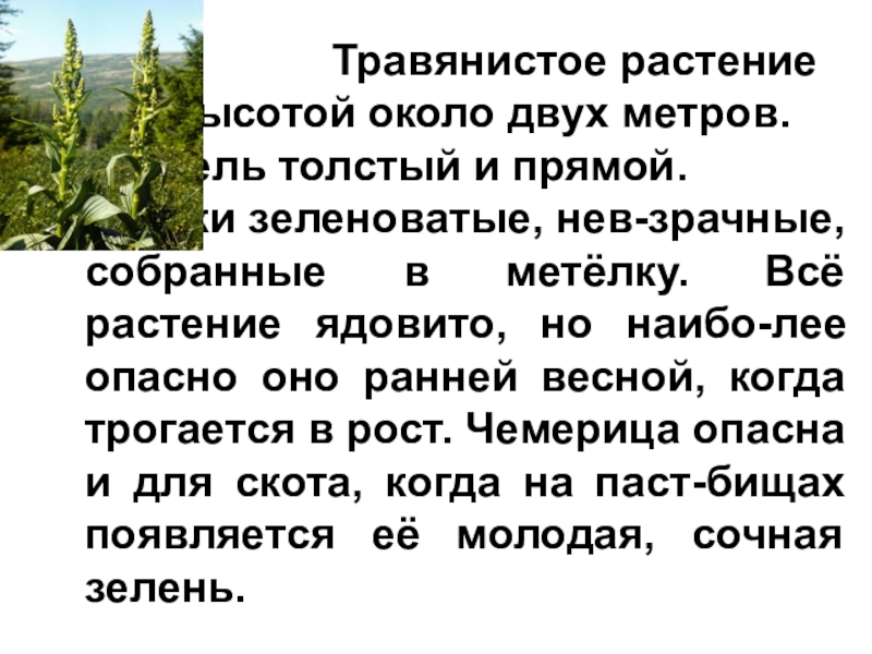 Травянистое растение высотой около двух метров. Стебель толстый и прямой. Цветки зеленоватые, нев-зрачные, собранные в метёлку. Всё растение ядовито, но наибо-лее опасно оно ранней весной, когда трогается в рост. Чемерица опасна и для скота, когда на паст-бищах появляется её молодая, сочная зелень.