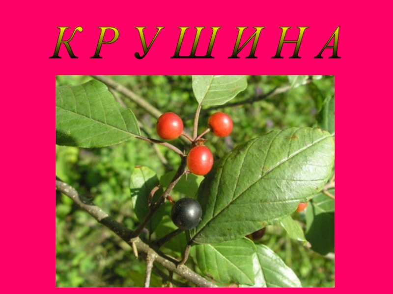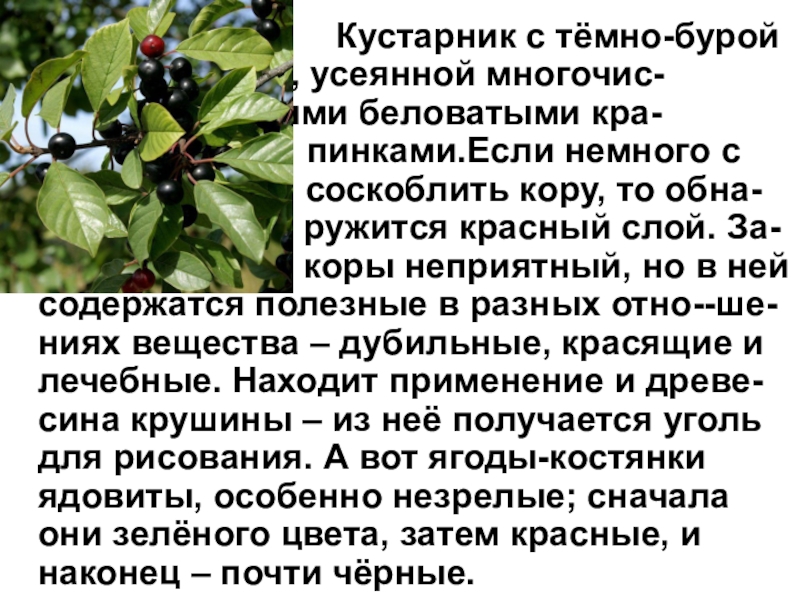 Кустарник с тёмно-бурой корой, усеянной многочис- лен- ленными беловатыми кра-пинками. пинками.Если немного с ос соскоблить кору, то обна-ру-жится ружится красный слой. За-пах к коры неприятный, но в ней содержатся полезные в разных отно--ше-ниях вещества – дубильные, красящие и лечебные. Находит применение и древе-сина крушины – из неё получается уголь для рисования. А вот ягоды-костянки ядовиты, особенно незрелые; сначала они зелёного цвета, затем красные, и наконец – почти чёрные.