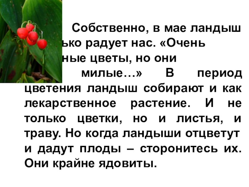 ландыш только радует нас. «Очень скромные цветы, но они такие милые…» В период цветения ландыш собирают и как лекарственное растение. И не только цветки, но и листья, и траву. Но когда ландыши отцветут и дадут плоды – сторонитесь их. Они крайне ядовиты.