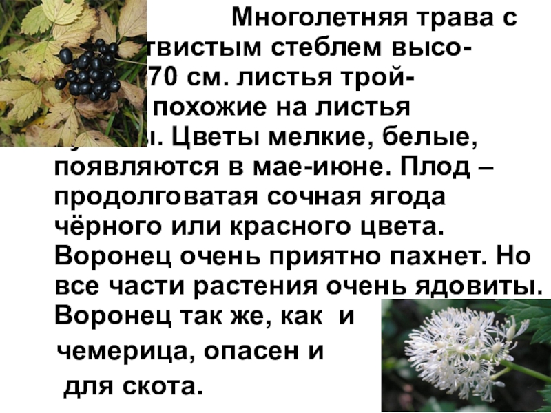 Многолетняя трава с ветвистым стеблем высо- той 30-70 см. листья трой- чатые, похожие на листья б бузины. Цветы мелкие, белые, появляются в мае-июне. Плод – продолговатая сочная ягода чёрного или красного цвета. Воронец очень приятно пахнет. Но все части растения очень ядовиты. Воронец так же, как и