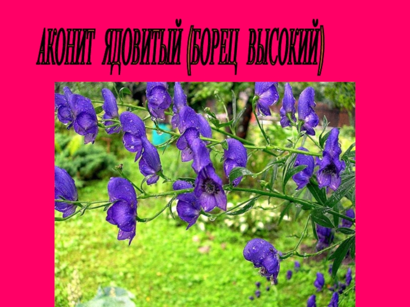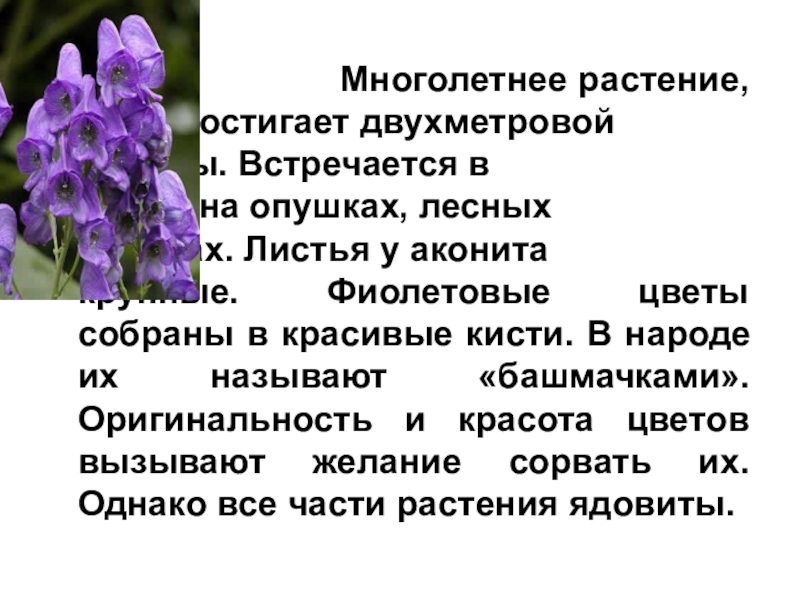Многолетнее растение, достигает двухметровой высоты. Встречается в лесах, на опушках, лесных полянах. Листья у аконита крупные. Фиолетовые цветы собраны в красивые кисти. В народе их называют «башмачками». Оригинальность и красота цветов вызывают желание сорвать их. Однако все части растения ядовиты.