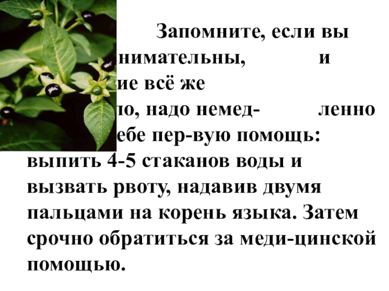 Запомните, если вы были невнимательны, и отравление всё же произошло, надо немед- ленно оказать себе пер-вую помощь: выпить 4-5 стаканов воды и вызвать рвоту, надавив двумя пальцами на корень языка. Затем срочно обратиться за меди-цинской помощью.