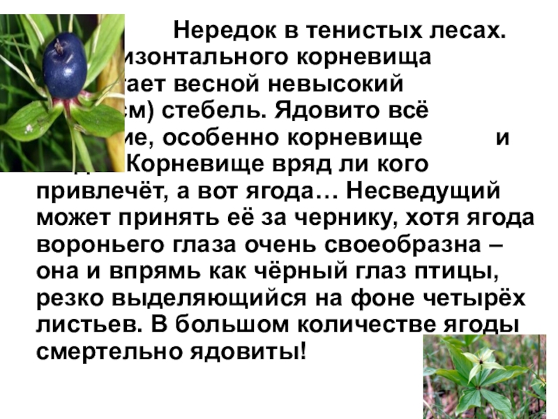 Нередок в тенистых лесах. Из горизонтального корневища вырастает весной невысокий (15-30 см) стебель. Ядовито всё растение, особенно корневище и ягоды. Корневище вряд ли кого привлечёт, а вот ягода… Несведущий может принять её за чернику, хотя ягода вороньего глаза очень своеобразна – она и впрямь как чёрный глаз птицы, резко выделяющийся на фоне четырёх листьев. В большом количестве ягоды смертельно ядовиты!