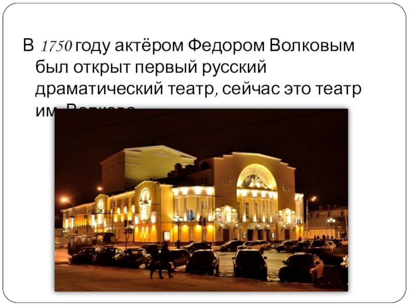Слайд 8В 1750 году актёром Федором Волковым был открыт первый русский драматический