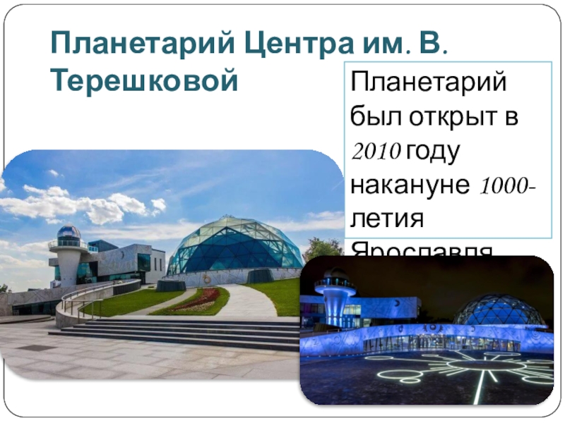 Планетарий Центра им. В. Терешковой Планетарий был открыт в 2010 году накануне 1000-летия Ярославля.