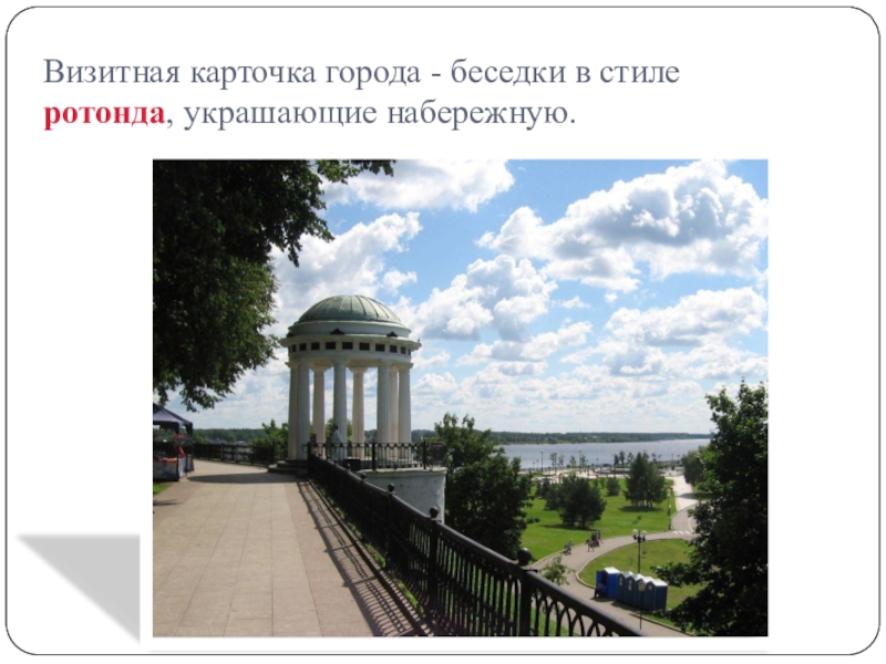 Слайд 6Визитная карточка города - беседки в стиле ротонда, украшающие набережную.