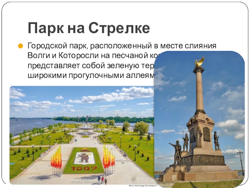 Парк на СтрелкеГородской парк, расположенный в месте слияния Волги и Которосли на песчаной косе. Он представляет собой