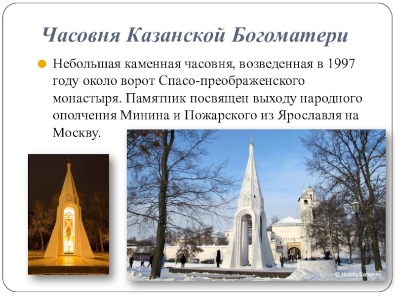 Часовня Казанской Богоматери Небольшая каменная часовня, возведенная в 1997 году около ворот Спасо-преображенского монастыря. Памятник посвящен выходу
