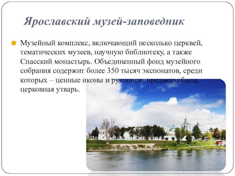 Ярославский музей-заповедник Музейный комплекс, включающий несколько церквей, тематических музеев, научную библиотеку, а также Спасский монастырь. Объединенный фонд