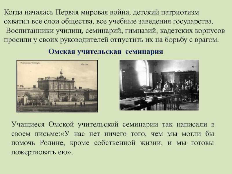 Учащиеся Омской учительской семинарии так написали в своем письме:«У нас нет ничего того, чем мы могли бы помочь Родине, кроме собственной жизни, и мы готовы пожертвовать ею».