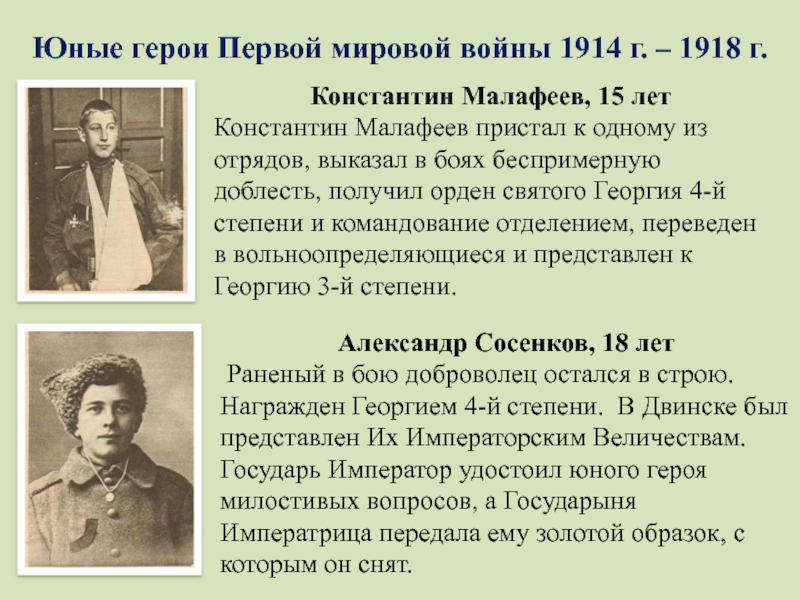 Петя Христич - 15 лет, награжден орденом святого Георгия 3-й степени и 4-й степени. Миша Власов - 13 лет, награжден орденом святого Георгия 4-й степени