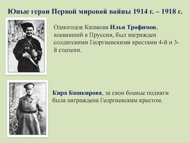 Иван Казаков, 15 лет. Он несколько раз отличился в боях с немцами: отбил пулемет, спас прапорщика Юницкого, ходил в разведку. Грудь юного героя украсили три Георгиевских креста и три Георгиевские медали, а плечи — погоны унтер-офицера.