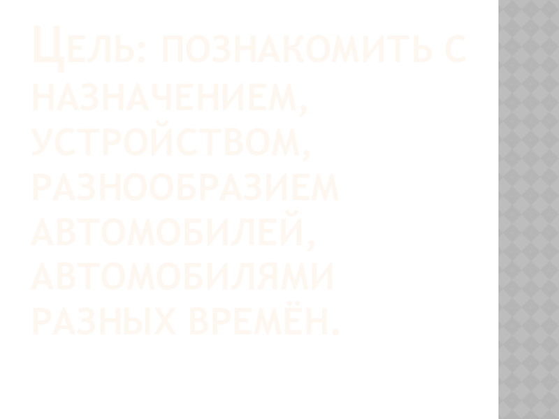 Слайд 2Цель: познакомить с назначением, устройством, разнообразием автомобилей, автомобилями разных времён.