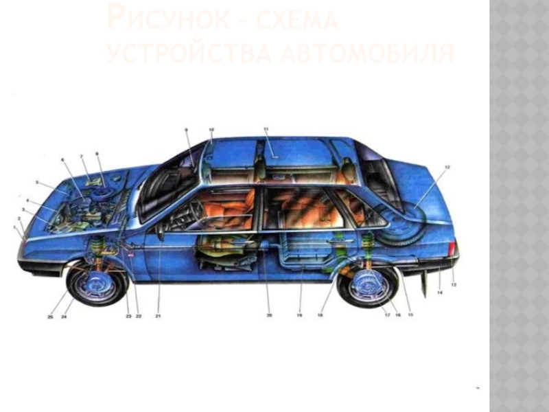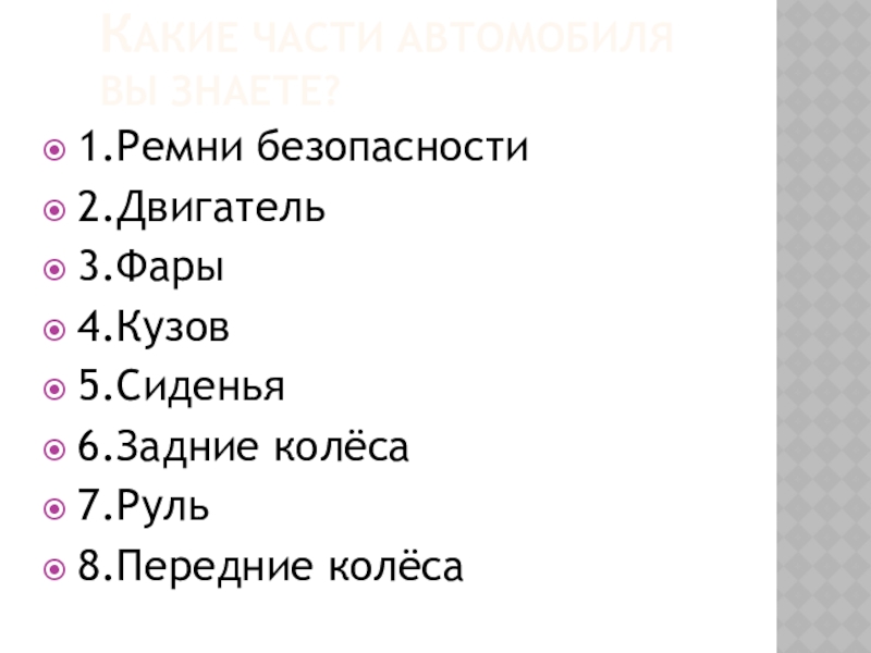 Какие части автомобиля вы знаете?1.Ремни безопасности2.Двигатель3.Фары4.Кузов5.Сиденья6.Задние колёса7.Руль8.Передние колёса