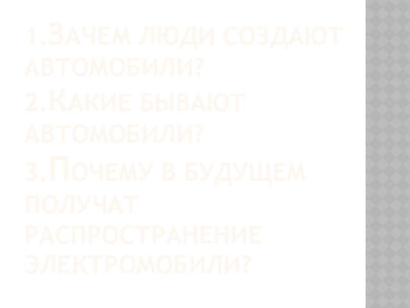 1.Зачем люди создают автомобили? 2.Какие бывают автомобили? 3.Почему в будущем получат распространение электромобили?