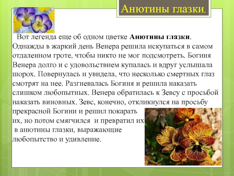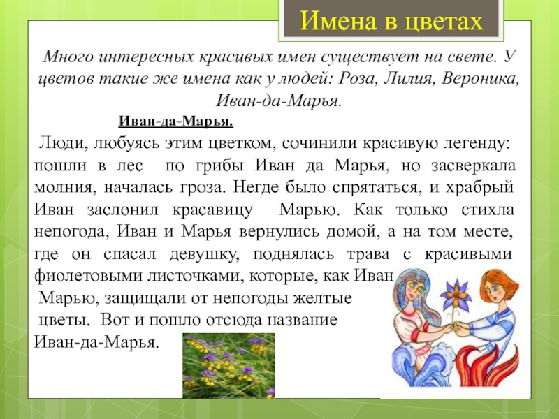 Люди, любуясь этим цветком, сочинили красивую легенду: пошли в лес по грибы Иван да Марья, но засверкала молния, началась гроза. Негде было спрятаться, и храбрый Иван заслонил красавицу Марью. Как только стихла непогода, Иван и Марья вернулись домой, а на том месте, где он спасал девушку, поднялась трава с красивыми фиолетовыми листочками, которые, как Иван