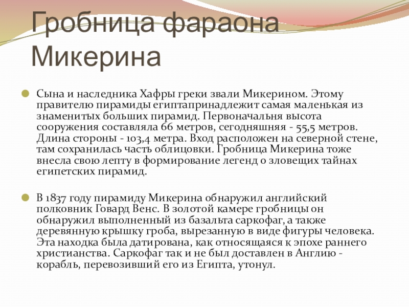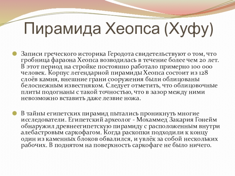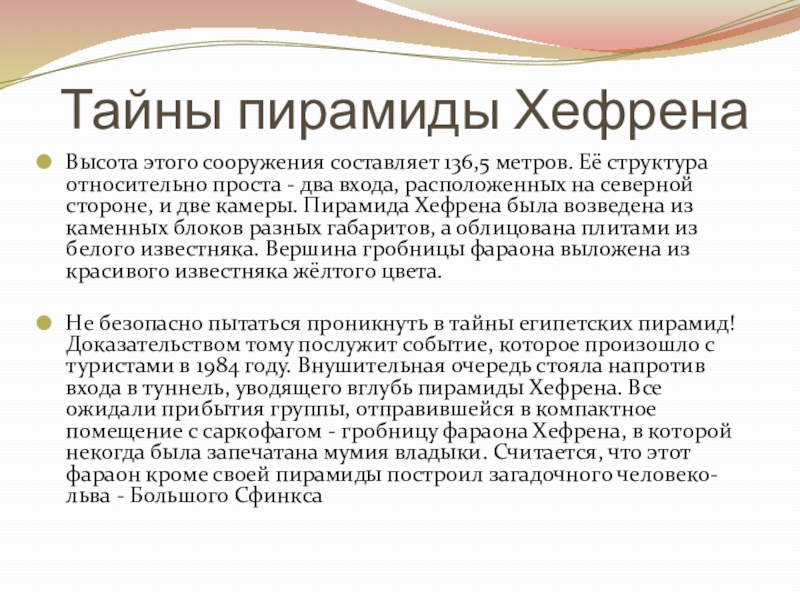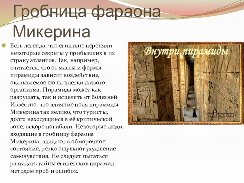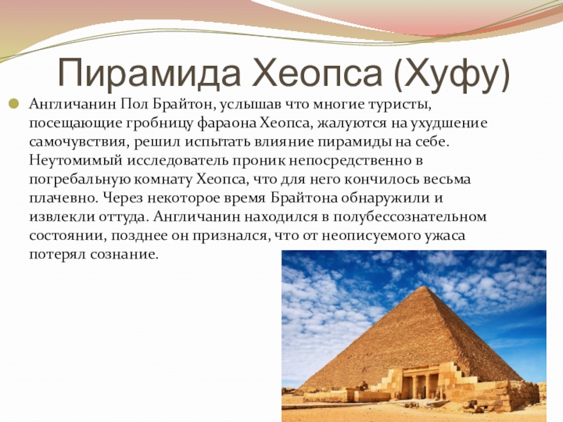 Египетских пирамид насчитывается более семидесяти, но только три из них стали самыми знаменитыми. Это гробницы фараонов, расположенные в Гизе - пирамиды Хефрена (Хафра), Хеопса (Хуфу) и Мекерина (Менкаура). Именно с ними связано большинство древних преданий, загадочных легенд и необъяснимых происшествий.