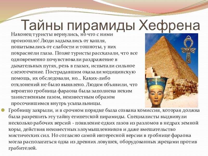 Наконец туристы вернулись, но что с ними произошло! Люди задыхались от кашля, пошатывались от слабости и тошноты, у них покраснели глаза. Позже туристы рассказали, что все одновременно почувствовали раздражение в дыхательных путях, резь в глазах, испытали сильное слезотечение. Пострадавшим оказали медицинскую помощь, их обследовали, но... Каких-либо отклонений не было выявлено. Людям объявили, что вероятно гробница фараона была заполнена неким таинственным газом, неизвестным образом просочившимся внутрь усыпальницы.
