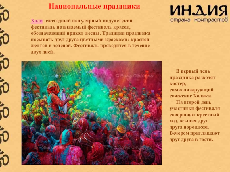 весны. Традиция праздника посыпать друг друга цветными красками: красной желтой и зеленой. Фестиваль проводится в течение двух дней.