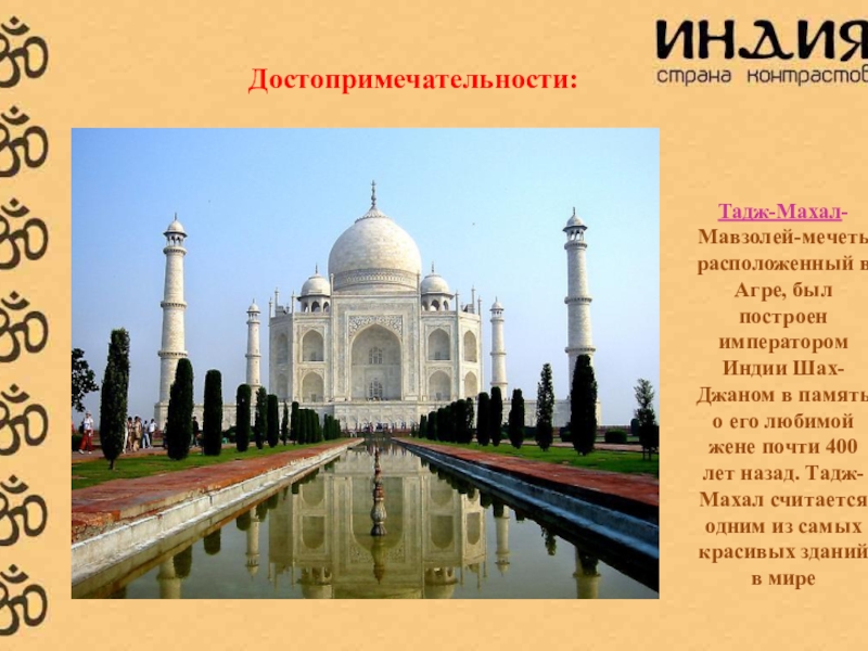 Тадж-Махал-Мавзолей-мечеть расположенный в Агре, был построен императором Индии Шах-Джаном в память о его любимой жене почти 400 лет назад. Тадж-Махал считается одним из самых красивых зданий в мире